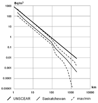 The ICPR 65 model[61] follows the same approach, and estimates the relative lifelong risk probability of radon-induced cancer death to 1.23 × 10−6 per Bq/(m3·year).[62] This relative risk is a global indicator; the risk estimation is independent of sex, age, or smoking habit. Thus, if a smoker's chances of dying of lung cancer are 10 times that of a nonsmoker's, the relative risks for a given radon exposure will be the same according to that model, meaning that the absolute risk of a radon-generated cancer for a smoker is (implicitly) tenfold that of a nonsmoker. The risk estimates correspond to a unit risk of approximately 3–6 × 10−5 per Bq/m3, assuming a lifetime risk of lung cancer of 3%. This means that a person living in an average European dwelling with 50 Bq/m3 has a lifetime excess lung cancer risk of 1.5–3 × 10−3. Similarly, a person living in a dwelling with a high radon concentration of 1000 Bq/m3 has a lifetime excess lung cancer risk of 3–6%, implying a doubling of background lung cancer risk.[63]