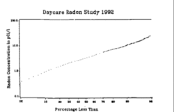 The distribution of radon concentrations is highly skewed: the larger concentrations have a disproportionately greater weight. Indoor radon concentration is usually assumed to follow a lognormal distribution on a given territory.[18] Thus, the geometric mean is generally used to estimate the "average" radon concentration in an area.[19]