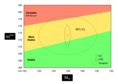 The diagrams show the uncertainty ranges of Higgs boson and top quark masses as oval-shaped lines. Underlying colors indicate if the electroweak vacuum state is likely to be stable, merely long-lived or completely unstable for given combination of masses.[24][25] The "electroweak vacuum decay" hypothesis was sometimes misreported as the Higgs boson "ending" the universe.[26][27][28]