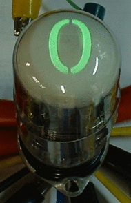 In March 1967,[11] IEE introduced another numeric display unit that is in essence a miniature cathode-ray tube. The tube has ten electron guns in two rows of five, each pointed to number-shaped stencils on a mask; when a number is selected, one of the guns fires through the corresponding stencil, onto the phosphor-coated glass screen on the face of the tube.[12] This display, later named the nimo tube,[13] was described by Electronic Design as "fairly simple" compared to other CRT-based digital display solutions due to the lack of a need for a deflection yoke.[12] Electronic Equipment Engineering called it an advancement of their rear-projection displays.[13] The anode required 2 (or 2.5[11]) kV for operation but only about 30 µA of current; IEE sold the power supplies separately. Suggested applications of the tube in 1967 included voltmeters, digital counters, and cockpit readouts. Only tubes with a green (P31) phosphor were available at launch;[12] purchasers could later choose any phosphor they desired.[13]