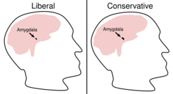 Students who reported more conservative political views were found to have larger amygdala,[5] a structure in the temporal lobes whose primary function is in the formation, consolidation and processing of memory, as well as positive and negative conditioning (emotional learning).[7] The amygdala is responsible for important roles in social interaction, such as the recognition of emotional cues in facial expressions and the monitoring of personal space,[8][9] with larger amygdalae correlating with larger and more complex social networks.[10][11] It is also postulated to play a role in threat detection, including modulation of fear and aggression to perceived threats.[12][13][14] Conservative students were also found to have greater volume of gray matter in the left insula and the right entorhinal cortex.[5] There is evidence that conservatives are more sensitive to disgust[15] and one role of the insula is in the modulation of social emotions, such as the feeling of disgust to specific sights, smells and norm violations.[16][17][18]