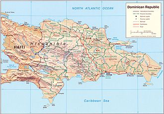 An enlargeable relief map of the Dominican Republic, located on the island of Hispaniola, which it shares with Haiti.