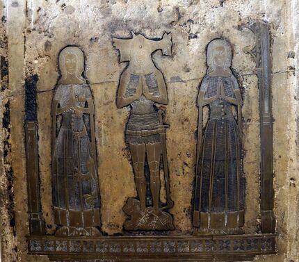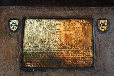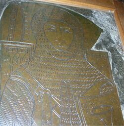 No surviving brasses in England can be dated earlier than the late 13th century. Early examples that do survive include a fragment from the brass to Bishop Thomas de Cantilupe (d. 1282) in Hereford Cathedral; and brasses to Margaret de Camoys (d. 1310) at Trotton, West Sussex; Joan de Cobham (c. 1310) at Cobham, Kent; Archbishop William Greenfield (d. 1315) in York Minster; Sir William de Setvans (c. 1323) at Chartham, Kent; and Sir Roger de Trumpington (c. 1326) in Trumpington, Cambridgeshire.[3] The life-sized brass of Sir John d'Aubernon II (d. 1277) at St Mary's Church, Stoke d'Abernon in Surrey has the decorations of the shield filled in with a species of enamel. Other examples of this occur, and the probability is that, in most cases, the lines of the engraving were filled with colouring matter, though brass would scarcely bear the heat requisite to fuse the ordinary enamels.[1] Like three-dimensional effigies of the same period in stone and wood, several early 14th-century military brasses (including those of Setvans, Trumpington and d'Aubernon mentioned above) depict their subjects with crossed legs, but there is no substance to the long-established myth that this pose identifies the deceased as a crusader.[4]