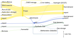 The first study using DIETER examines the power storage requirements for renewables uptake ranging from 60% to 100%. Under the baseline scenario of 80% (the lower bound German government target for 2050), grid storage requirements remain moderate and other options on both the supply side and demand side offer flexibility at low cost. Nonetheless, storage plays an important role in the provision of reserves. Storage becomes more pronounced under higher shares of renewables, but strongly depends on the costs and availability of other flexibility options, particularly biomass availability.[37]
