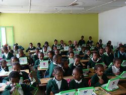 M-learning (or m-education), or the use of mobile technology in the service of education, is a recent practice, opening up fresh possibilities in the educational field. Given the shortage of books in many African schools, the digital tablet was soon seen as a solution to make up for the missing textbooks, and taken up both by governments and international organizations. In practice, this shortage is one that affects almost every African country. In Cameroon there is on average one textbook on reading per 11 pupils and one mathematics book per 13 children.[17] The price of digital content on tablets is falling sharply compared to the traditional media (books, CD and DVD, etc.). One digital textbook, for instance, costs one-third to half the price of a paper textbook,[18] with zero marginal cost.[1]