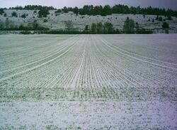 From Handwiki A Headland, in agriculture, is the area at each end of a planted field.[1] In some areas of the United States , this area is known as the Turnrow. It is used for turning around with farm implements during field operations and is the first area to be harvested to minimize crop damage. The rows run perpendicular to the lay of the field and are usually two, three or four times the width of the implement used for planting the field.