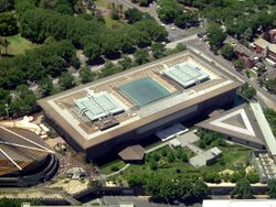 The Field was the inaugural exhibition at the National Gallery of Victoria’s new premises on St Kilda Road, Melbourne.[1] Launched by the director of London’s Tate gallery, Norman Reid,[2] before an audience of 1,000 invitees, it was held between held 21 August and 28 September 1968. Hailed then,[3][4] and regarded since as a landmark exhibition in Australian art history,[5] it presented the first comprehensive display of colour field painting and abstract sculpture in the country in a radical presentation,[6] between silver foil–covered walls and under geometric light fittings, of 74 works by 40 artists. All practised hard-edge, geometric, colour and flat abstraction, often in novel media including coloured or transparent plastic, fluorescent acrylic paints,[7] steel and chrome. The art was appropriate to a launch of the new venue itself, designed by architect Roy Grounds, and emphatically rectilinear; cubes nested in a basalt rectangular box amongst the other buildings of the new Arts Centre, each based on a geometric solid. Echoing emerging international stylistic tendencies of the time, The Field sparked immediate controversy and launched the careers of a new generation of Australian artists.