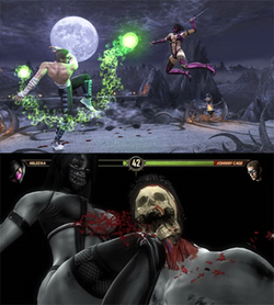 Extra features include a story mode during which the player plays as multiple characters,[10] a Fatality training mode (allowing players to practice executing finishing moves),[11] the Challenge Tower, tag team fighting, and an online mode. The Challenge Tower mode is a single-player option that includes 300 specific challenges of various difficulties providing currency rewards upon completion; players have the option of using in-game currency to bypass other difficult challenges, completing them later.[8][11] Among the various challenges are "Test Your Might" (rapidly pressing buttons and using specific timing to destroy blocks of varying difficulty), "Test Your Sight" (following an object hidden under a cup or skull and revealing the object after a shuffle), "Test Your Strike" (destroying a specific block in a stack) and "Test Your Luck" (fighting under certain conditions, such as no jumping[11]). The four-player tag-team feature is an original feature, allowing two players to play together.[12] During tag gameplay, two new types of attacks become available. The first of them is the "tag assist" attack, in which the off-screen character temporarily jumps in and performs certain attacks during the active character's combo. The other is the "tag kombo", in which the active character performs a combo that is finished by the off-screen character as they enter the fight.[8]