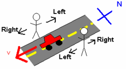For a simple example involving only the orientation of two observers, consider two people standing, facing each other on either side of a north-south street. See Figure 2. A car drives past them heading south. For the person facing east, the car was moving towards the right. However, for the person facing west, the car was moving toward the left. This discrepancy is because the two people used two different frames of reference from which to investigate this system.