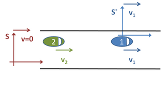 Alternatively, we could choose a frame of reference S′ situated in the first car. In this case, the first car is stationary and the second car is approaching from behind at a speed of v2 − v1 = 8 m/s. In order to catch up to the first car, it will take a time of d/v2 − v1 = 200/8 s, that is, 25 seconds, as before. Note how much easier the problem becomes by choosing a suitable frame of reference. The third possible frame of reference would be attached to the second car. That example resembles the case just discussed, except the second car is stationary and the first car moves backward towards it at 8 m/s.