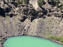 Some of the open pits were filled with thick and slow-moving lava to form the South Deadman Creek, Glass Creek and Obsidian Flow domes.[36] Others, such as the Inyo Crater Lakes near Deer Mountain, remained open and were later partially filled with water. Smaller explosion pits on the north side of Mammoth Mountain were also formed at this time.[28]:55 In the past 6,000 years, approximately 0.19 cubic miles (0.8 km3) of magma has been erupted from the Inyo part of the chain.[27]:233