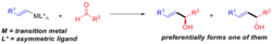 Asymmetric addition of alkenylmetals to aldehydes is a chemical reaction in enantioselective synthesis that reacts an alkenylmetal with an aldehyde to give an allyl alcohol (Figure "Asymmetric addition of alkenylmetals to aldehydes"). The stereoselectivity in the reaction is typically controlled by the asymmetric ligands used providing a strategy to introduce controlled asymmetry into the molecule.[1][2] Controlled molecular asymmetry (or enantioselectivity) is crucial for controlling the bioactivity of the synthesized molecules and demanded by drug authorities in drug synthesis. In this case the ligands chelate to the transition metal to create a chiral environment which enables the selective formation of a particular enantiomer. Various transition metals such as Zinc, Nickel, Chromium, and Rhodium have been used in this reaction.