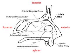 One of the most common medical conditions involving the nose is a nosebleed (epistaxis). Most nosebleeds occur in Kiesselbach's plexus, a vascular plexus in the lower front part of the septum involving the convergence of four arteries. A smaller proportion of nosebleeds that tend to be nontraumatic occur in Woodruff's plexus. Woodruff's plexus is a venous plexus of large thin-walled veins lying in the posterior part of the inferior meatus.[46]