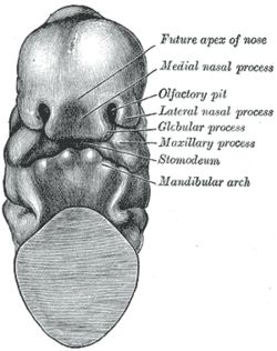 In the early development of the embryo, neural crest cells migrate to form the mesenchymal tissue as ectomesenchyme of the pharyngeal arches. By the end of the fourth week, the first pair of pharyngeal arches form five facial prominences or processes - an unpaired frontonasal process, paired mandibular processes and paired maxillary processes.[50][51] The nose is largely formed by the fusion of these five facial prominences. The frontonasal process gives rise to the bridge of the nose. The medial nasal processes provide the crest and the tip of the nose, and the lateral nasal processes form the alae or sides of the nose. The frontonasal process is a proliferation of mesenchyme in front of the brain vesicles,[50] and makes up the upper border of the stomadeum.[51]