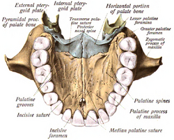 The wall separating the two cavities of the nose, the nasal septum, is made up of bone inside and cartilage closer to the tip of the nose.[3] The bony part is formed by the perpendicular plate of the ethmoid bone at the top, and the vomer bone below.[3] The floor of the nose is made up of the incisive bone and the horizontal plates of the palatine bones, and this makes up the hard palate of the roof of the mouth. The two horizontal plates join at the midline and form the posterior nasal spine that gives attachment to the musculus uvulae in the uvula.