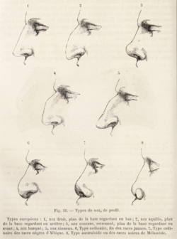 Paul Topinard developed the nasal index as a method of classifying ethnic groups. The index is based on the ratio of the breadth of the nose to its height.[36] The nasal dimensions are also used to classify nasal morphology into five types: Hyperleptorrhine is a very long, narrow nose with a nasal index of 40 to 55.[37] Leptorrhine describes a long, narrow nose with an index of 55–70.[37] Mesorrhine is a medium nose with an index of 70–85. Platyrrhine is a short, broad nose with an index of 85–99·9. The fifth type is the hyperplatyrrhine having an index of more than 100.[37] Variations in nose size between ethnicities may be attributed to differing evolutionary adaptations to local temperatures and humidity. Other factors such as sexual selection may also account for ethnic differences in nose shape. [38]