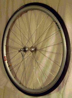 A variation on the wire-spoked wheel was Tioga's "Tension Disk", which appeared superficially to be a solid disk but was in fact constructed using the same principles as a normal tension-spoked wheel. Instead of individual wire spokes, a continuous thread of Kevlar (aramid) was used to lace the hub to the rim under high tension. The threads were encased in a translucent disk for protection and some aerodynamic benefit, but this was not a structural component.