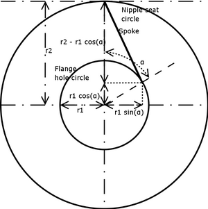 a is the angle between (1) the radius to a nipple hole in the rim to which a spoke is attached, and, (2) the radius to the flange hole holding the spoke. The spoke crosses either 1, 2, or 3 oppositely pointing spokes depending on the lacing design. On the flange, the angle between the radii of adjacent holes is 360°/m (for equally spaced holes). For each spoke crossed, the hub is rotated with reference to the rim one "angle between adjacent flange holes". Thus, multiplying the "angle between adjacent flange holes" by k gives the angle a. For example, a 32 spoke wheel has 16 spokes per side, 360° divided by 16 equals 22.5°. Multiply 22.5° ("angle between adjacent flange holes") by the number of crossings to get the angle a—if 3-crosses, the 32 spoke wheel has an angle a of 67.5°. Regarding r3: The size of the spoke holes in the flange does not matter for the needed spoke length. This term removes the effect of the hole size. Since the holes are usually small (just over 2 mm in diameter), the effect is small and in practice matters little.