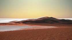 Louth contains the lowest-latitude permanent deposit of water ice on the Martian surface, in a mound situated at the crater's center.[7][8] The mound is quasi-circular and has an approximate diameter of 10 kilometres (6.2 miles).[9] The steady-state value for the albedo of the central ice mound is 0.431.[8] The mound consists of smaller ice grains interspersed with more palagonite contaminant at its edge, compared to the center.[4][3] Large grains of ice suggest that the central portion is the oldest in age, and brought to the surface either through the sublimation of ice or aeolian processes.[4] The water ice at the center of the crater as analyzed through spectral modelling determined that the water ice at the center of the mound was 99-percent pure at the optical surface.[4] The ice mound was determined to be similar in texture and composition to the northern polar ice cap.[10][11] Studies of the crater's interior, knowing their similar makeup, can yield insight on the interaction between the north polar region and the atmosphere.[12] Additionally, craters with ice mounds such as Louth can serve as records of the Amazonian era of Martian geology.[13] Craters like Louth have been used as potential analogues for understanding similar processes occurring on Pluto.[14][15]