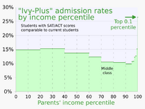 Ivy-Plus university admissions rates vary with the income of the students' parents, with the acceptance rate of the top 0.1% income percentile being almost twice as much as other students.[65]