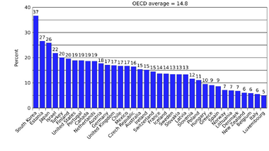 Income inequality in OECD countries is at its highest level for the past half century. The ratio between the bottom 10% and the top 10% has increased from 1:7 to 1:9 in 25 years.[17]