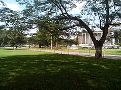 The older and wealthier part of the city (ville basse) is located on a flat area of alluvial sand and clay near the river, while many newer areas are found on the eroding red soil of surrounding hills.[2][45] Older parts of the city were laid out on a geometric pattern, with de facto racial segregation becoming de jure in 1929 as the European and African neighborhoods grew closer together. City plans of the 1920s–1950s featured a cordon sanitaire or buffer between the white and black neighborhoods, which included the central market as well as parks and gardens for Europeans.[50]