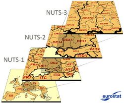 Nomenclature of Territorial Units for Statistics or NUTS (French: Nomenclature des unités territoriales statistiques) is a geocode standard for referencing the administrative divisions of countries for statistical purposes.[1][2][3][4][5][6] The standard, adopted in 2003,[7] is developed and regulated by the European Union, and thus only covers the EU member states in detail. The Nomenclature of Territorial Units for Statistics is instrumental in the European Union's Structural Funds and Cohesion Fund delivery mechanisms and for locating the area where goods and services subject to European public procurement legislation are to be delivered.