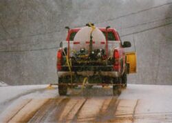For the purpose of preventing ice from forming on pavement, magnesium chloride is applied in three ways: anti-icing, which involves spreading it on roads to prevent snow from sticking and forming; prewetting, which means a liquid formulation of magnesium chloride is sprayed directly onto salt as it is being spread onto roadway pavement, wetting the salt so that it sticks to the road; and pretreating, when magnesium chloride and salt are mixed together before they are loaded onto trucks and spread onto paved roads. Calcium chloride damages concrete twice as fast as magnesium chloride.[15] The amount of magnesium chloride is supposed to be controlled when it is used for de-icing as it may cause pollution to the environment.[16]