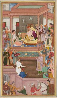 Abu'l-Fazl ibn Mubarak presenting Akbarnama to Mughal Azam Akbar, Mughal miniature