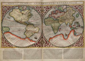 The world map by the Italian Amerigo Vespucci (from whose name the word America is derived) and Belgian Gerardus Mercator shows (besides the classical continents Europe, Africa, and Asia) the Americas as America sive India Nova, New Guinea, and other islands of Southeast Asia, as well as a hypothetical Arctic continent and a yet undetermined Terra Australis.