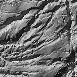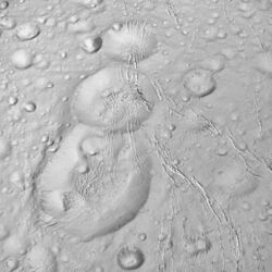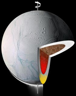 Enceladus was discovered on August 28, 1789, by William Herschel,[1][17][18] but little was known about it until the two Voyager spacecraft, Voyager 1 and Voyager 2, flew by Saturn in 1980 and 1981.[19] In 2005, the spacecraft Cassini started multiple close flybys of Enceladus, revealing its surface and environment in greater detail. In particular, Cassini discovered water-rich plumes venting from the south polar region.[20] Cryovolcanoes near the south pole shoot geyser-like jets of water vapor, molecular hydrogen, other volatiles, and solid material, including sodium chloride crystals and ice particles, into space, totaling about 200 kilograms (440 pounds) per second.[16][19][21] More than 100 geysers have been identified.[22] Some of the water vapor falls back as "snow"; the rest escapes and supplies most of the material making up Saturn's E ring.[23][24] According to NASA scientists, the plumes are similar in composition to comets.[25] In 2014, NASA reported that Cassini had found evidence for a large south polar subsurface ocean of liquid water with a thickness of around 10 km (6 mi).[26][27][28] The existence of Enceladus' subsurface ocean has since been mathematically modelled and replicated.[29]