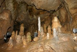 In 1906, Bing installed electric lights and turned the cavern into a tourist attraction.[1] He hired Konrad Arndt, who had worked on the initial excavations, as the site's overseer, and his niece, the enthusiastic amateur spelunker Olga Hirsch, worked as a guide. In 1909 a movie crew toured the cave and the resultant film was screened at the "cinematograph salon" of the Noris Theater in Nürnberg. The site soon became so popular that Bing personally conducted a private tour of the cave for Prince Ludwig of Bavaria.[1]