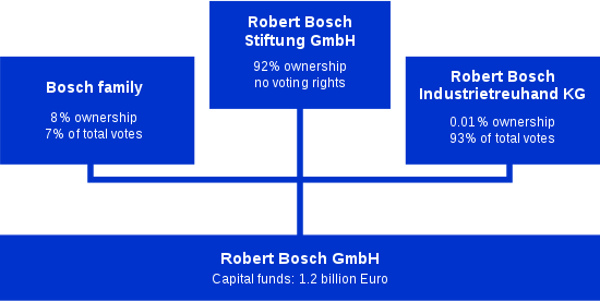 Robert Bosch GmbH, including its wholly owned subsidiaries, is unusual in that it is an extremely large, privately owned corporation that is almost entirely (92%) owned by a charitable foundation. Thus, while most of the profits are invested back into the corporation to build for the future and sustain growth, nearly all of the profits distributed to shareholders are devoted to humanitarian causes.