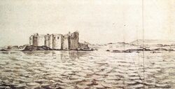 He departed for Salé on 20 July 1629 with a fleet composed of the ships Licorne, Saint-Louis, Griffon, Catherine, Hambourg, Sainte-Anne, Saint-Jean. He bombarded the city of Salé, destroyed three corsair ships, and then sent the Griffon under Captain Treillebois to Mogador. The men of Razilly saw the fortress of Castelo Real in Mogador and landed 100 men with wood and supplies on Mogador island, with the agreement of Richelieu. After a few days, however, the Griffon reembarked the colonists and departed to rejoin the fleet in Salé.[8]