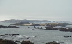 Essaouira is protected by a natural bay partially shielded from wave action by the Iles Purpuraires. A broad sandy beach extends from the harbour south of Essaourira, at which point the Oued Ksob discharges to the ocean; south of the discharge lies the archaeological ruin, the Bordj El Berod.[23] The Canary Current is responsible for the generally southward movement of ocean circulation and has led to enhancement of the local fishery.[24] The village of Diabat lies about five kilometres (3.1 miles) south of Essaouira, immediately south of the Oued Ksob.