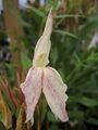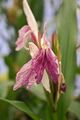 Like all members of the genus Roscoea, it dies back each year to a short vertical rhizome, to which are attached the tuberous roots. When growth begins again, "pseudostems" are produced: structures which resemble stems but are actually formed from the tightly wrapped bases (sheaths) of its leaves.[2] R. × beesiana is usually 48–60 cm tall, with seven to nine leaves, of which at most the lowest one consists only of a sheath. Each leaf has a small ligule, extending to about 1–2 mm. The blade of the leaf (the part free from the pseudostem) is usually 8–29 cm long (occasionally as little as 4 cm long) by 2.1–4.5 cm wide. There are small "ears" at the junction of the blade and sheath (i.e. the leaf is somewhat auriculate). The leaf sheath has reddish markings.[3]