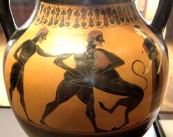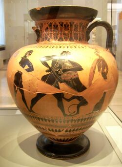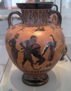 From Handwiki The Neck Amphora by Exekias is a neck amphora in the black figure style by the Attic vase painter and potter Exekias. It is found in the possession of the Antikensammlung Berlin under the inventory number F 1720 and is on display in the Altes Museum. It depicts Herakles' battle with the Nemean lion on one side and the sons of Theseus on the other (their earliest appearance in Athenian art). The amphora could only be restored for the first time almost a hundred and fifty years after its original discovery due to negligence and political difficulties.