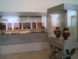 In addition to the art historical significance of the vase, the fate of the amphora and its individual sherds since its discovery is also of archaeological-historical significance.[4] The vase was found in the Etruscan necropolis of Ponte dell' Abbadia near Vulci. In Athens, vases were produced largely for export to Etruria, where they were often used as grave goods. Thus, several works of Exekias have been found in Etruscan cemeteries. When the amphora was discovered in one of the Etruscan graves at Vulci which had been under excavation from 1828, it was already broken and was probably no longer complete. The sherds that were discovered were not very carefully collected. The reconstruction of the vase from its sherds was, by modern standards, faulty. As was common in the mid-nineteenth century, missing pieces were replaced and repainted to create the appearance of a complete work. After the restoration, the amphora came into the possession of the painter Eduard Magnus. The sale of smaller archaeological discoveries was common at the time, particularly when no other, more expensive and higher valued artworks (statuary or precious metals) could be found. Together with the painter's other pieces (known as the Dorow-Magnus Collection), the amphora soon entered the newly founded Museum at Lustgarten, in 1831. It stayed, with other items of portable art, in the semi-basement of the museum. According to Jakob Andreas Konrad Levezow's 1834 exhibition catalogue, the vase stood on one of the glass tables placed in a prominent position. When the portable art collection was transferred to the Neue Galerie New York, Exekias' Amphora was taken there as well.