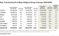 Predicted European population by religion, without adherence to race. As most European countries neither keep census records for race nor religion, the Muslim identity is usually based on country of origin. The number of "Muslims" almost certainly includes non-Muslims from Muslim countries, as they are more likely to emigrate to secular countries.[7]