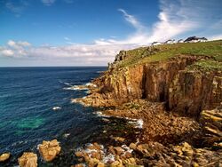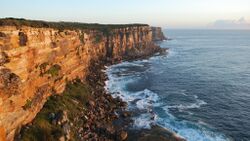 A headland, also known as a head, is a coastal landform, a point of land usually high and often with a sheer drop, that extends into a body of water. It is a type of promontory. A headland of considerable size often is called a cape.[1] Headlands are characterised by high, breaking waves, rocky shores, intense erosion, and steep sea cliff.