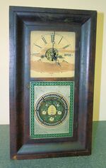 "Ogee clocks" were a common type of weight-driven 19th-century pendulum clock presented in a simplified Gothic style, with the original design attributed to Chauncey Jerome.[11] Ogee clocks were typically made in the United States, as mantelpieces or to mount to a wall bracket,[citation needed] and are one of the most commonly encountered varieties of American antique clocks.[citation needed] The overall design was rectangular, with framing by moulding with an ogee-profile surrounding a central glass door with a painted scene below the clock face, a door that protected the clock face and pendulum.[citation needed] Weights supported by pulleys fell inside the ogee moulding and so were hidden from view.[citation needed]