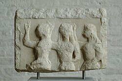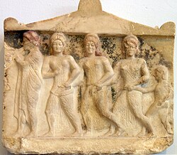 The earliest representation of these goddesses was found in a temple of Apollo in Thermon dated to the seventh to sixth century BCE.[33] It is possible, however, that the Charites are represented on a Mycenean golden seal ring that depicts two female figures dancing in the presence of a male figure, who has been interpreted as Hermes or Dionysus.[33] Another early representation of the Charites, from a relief at the Paros colony of Thasos dated to the beginning of the fifth century BCE, shows the Charites with Hermes and either Aphrodite or Peitho, which marked the entrance to the old city.[33] The opposite side of the relief shows Apollo being crowned by Artemis with nymphs in the background. At the entrance of the Akropolis, there was a famous Classical era relief of the Charites and Hermes, and the popular belief was that the sculptor was Socrates, although this is very unlikely.[4]