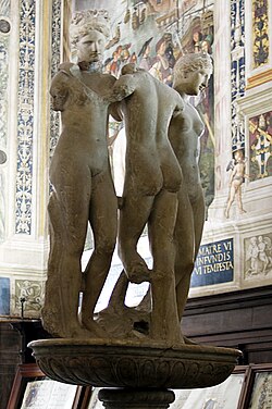 Clark writes that "For some reason the nakedness of the Graces was free from moral opprobium, and in consequence they furnished the subject through which pagan beauty was first allowed to appear in the 15th century".[40] Indeed, a large marble Graeco-Roman group, which was a key model in the Renaissance,[40] when it was in the Piccolomini Library, is now displayed in Siena Cathedral.