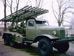 In June 1938, the Soviet Reaction-Engine Scientific Research Institute (RNII) in Moscow was authorized by the Main Artillery Directorate (GAU) to develop a multiple rocket launcher for the RS-132 aircraft rocket (RS for Reaktivnyy Snaryad, 'rocket-powered shell')[7]. I. Gvay led a design team in Chelyabinsk, Russia, which built several prototype launchers firing the modified 132 mm M-132 rockets over the sides of ZiS-5 trucks. These proved unstable, and V.N. Galkovskiy proposed mounting the launch rails longitudinally. In August 1939, the result was the BM-13 (BM stands for боевая машина (translit. boyevaya mashina), 'combat vehicle' for M-13 rockets).[1]