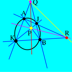 Let C be a conic in PG(2, F) where F is a field not of characteristic two, and let P be a point of this plane not on C. Two distinct secant lines to the conic, say AB and JK determine four points on the conic (A, B, J, K) that form a quadrangle. The point P is a vertex of the diagonal triangle of this quadrangle. The polar of P with respect to C is the side of the diagonal triangle opposite P.[23]