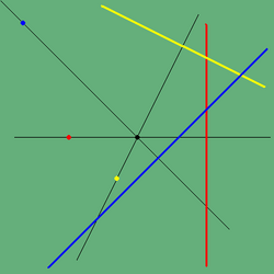 In order to turn this process into a correlation, the Euclidean plane (which is not a projective plane) needs to be expanded to the extended euclidean plane by adding a line at infinity and points at infinity which lie on this line. In this expanded plane, we define the polar of the point O to be the line at infinity (and O is the pole of the line at infinity), and the poles of the lines through O are the points of infinity where, if a line has slope s (≠ 0) its pole is the infinite point associated to the parallel class of lines with slope −1/s. The pole of the x-axis is the point of infinity of the vertical lines and the pole of the y-axis is the point of infinity of the horizontal lines.