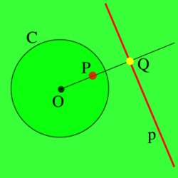 In the Euclidean plane, fix a circle C with center O and radius r. For each point P other than O define an image point Q so that OP ⋅ OQ = r2. The mapping defined by P → Q is called inversion with respect to circle C. The line p through Q which is perpendicular to the line OP is called the polar[21] of the point P with respect to circle C.