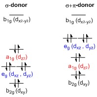 A general d-orbital splitting diagram for square planar (D4h) transition metal complexes can be derived from the general octahedral (Oh) splitting diagram, in which the dz2 and the dx2−y2 orbitals are degenerate and higher in energy than the degenerate set of dxy, dxz and dyz orbitals. When the two axial ligands are removed to generate a square planar geometry, the dz2 orbital is driven lower in energy as electron-electron repulsion with ligands on the z-axis is no longer present. However, for purely σ-donating ligands the dz2 orbital is still higher in energy than the dxy, dxz and dyz orbitals because of the torus shaped lobe of the dz2 orbital. It bears electron density on the x- and y-axes and therefore interacts with the filled ligand orbitals. The dxy, dxz and dyz orbitals are generally presented as degenerate but they have to split into two different energy levels with respect to the irreducible representations of the point group D4h. Their relative ordering depends on the nature of the particular complex. Furthermore, the splitting of d-orbitals is perturbed by π-donating ligands in contrast to octahedral complexes. In the square planar case strongly π-donating ligands can cause the dxz and dyz orbitals to be higher in energy than the dz2 orbital, whereas in the octahedral case π-donating ligands only affect the magnitude of the d-orbital splitting and the relative ordering of the orbitals is conserved.[1]