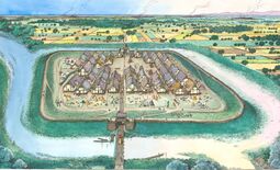The Terramare was a Middle and Recent Bronze Age culture, between the 16th and the 12th centuries B.C., in the area of what is now Pianura Padana (specially along the Panaro river, between Modena and Bologna).[26] Their total population probably reached an impressive peak of more than 120,000 individuals near the beginning of the Recent Bronze Age.[27] In the early period they lived in villages with an average population of about 130 people living in wooden stilt houses: they had a square shape, built on land but generally near a stream, with roads that crossed each other at right angles. Over the lifetime of the Terramare culture, these settlements developed into stratified zones with larger settlements of up to 15-20Ha (approximately 1500-2000 people) surrounded by smaller villages. Especially in the later period, the proportion of settlements that were fortified approaches 100%.