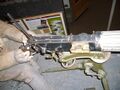 The Vickers is a fully automatic belt-fed firearm which is fired from a closed-bolt. When ready to fire, a round is in the chamber and the breechblock assembly and working parts are forward. It has a recoil operated, floating action with a toggle lock similar to a Luger pistol. However, unlike the Luger, the mechanism is totally contained within the receiver or body of the Vickers. When operated, the floating action, which consists of the barrel, breechblock assembly and toggle mechanism, reciprocate as a unit within the body of the gun. The mechanism is held together by recoiling plates, that connect the breech end of the barrel to the rear of the toggle mechanism. The breech is locked closed when the toggle is straight. The crank cocking handle is part of the floating action. It acts through the rear pivot of the toggle lock. Pulling the cocking handle causes the toggle to rise. This unlocks the breech and then draws the breechblock assembly rearward. While firing, the opposite end of the crank handle cams on a round lug fixed to the body. Rearward movement of the floating action tips the cocking handle and unlocks the toggle. The recoil that unlocks the toggle is gas assisted. Propellent gases leaving the muzzle are partly contained within the muzzle cap and act on the muzzle cup (attached to the barrel) to assist in propelling the floating action rearward to the point where the toggle mechanism is unlocked. The breechblock assembly then opens fully while opposed by a spring which ultimately returns it to the closed position. The spring under tension acts on a crank mounted on the opposite side of the body to the cocking handle.[45][46][47]